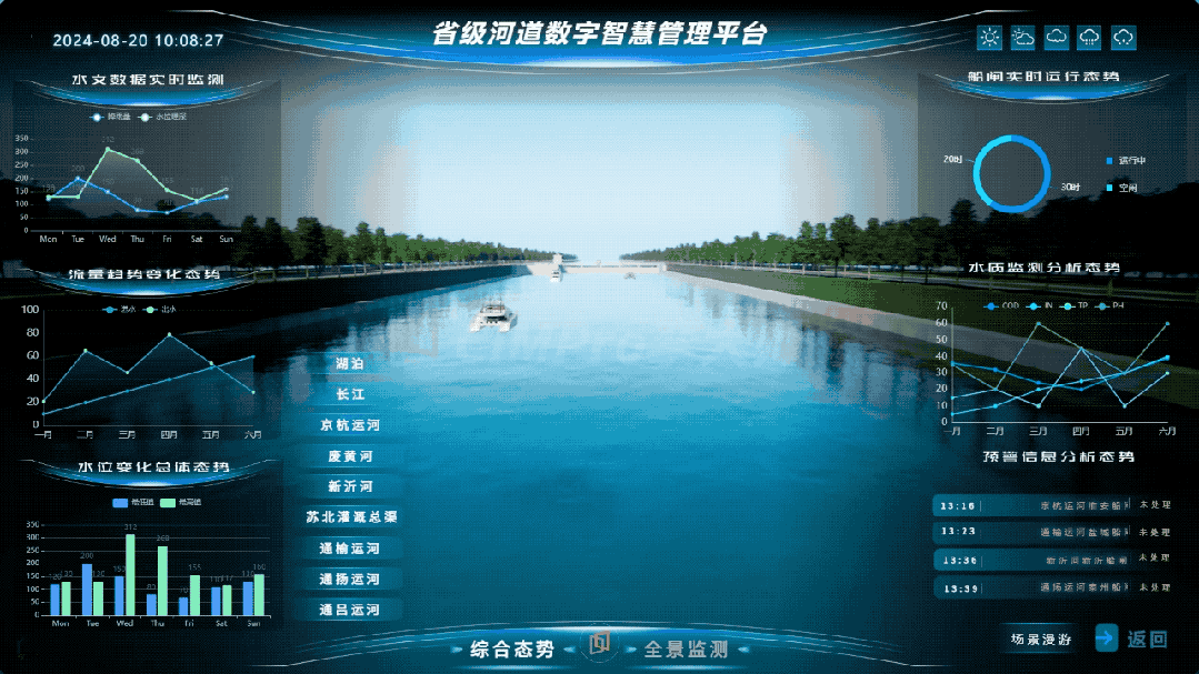数字孪生河道综合态势功能集成多维度动态监测,实时展示水文数据波动(如降雨量、蒸发量)、流量趋势模拟(基于历史与实时数据预测洪峰或枯水期)、水位变化全景分析(结合气象与地形数据动态模拟涨落);同步呈现船闸运行状态(三维建模显示启闭状态与设备参数)、水质多指标监测(溶解氧、氨氮等污染物实时追踪与热力图展示),并通过智能预警系统(四预功能)自动触发阈值报警并生成处置预案。